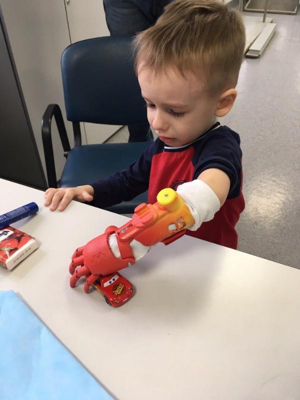 Первым пользователем наших протезов в столице Сибири стал 5-летний Даниил. Получив свою новую красно-оранжевую суперруку Даниил сразу стал применять ее в деле. С ней он прокатился на самокате и попробовал поднимать различные предметы. Родители Даниила признались, что сбылась их мечта – у мальчика появился функциональный, удобный и красивый протез руки.