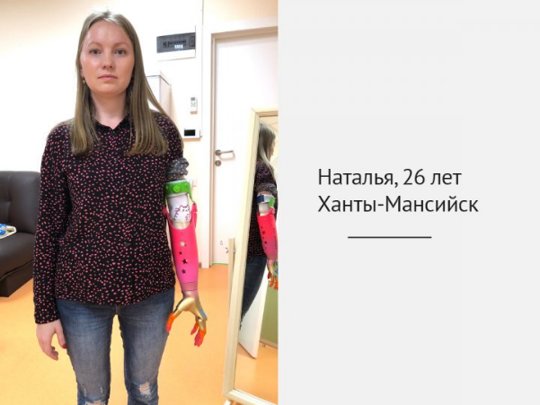 Знакомьтесь, это Наталья. Наталье 26 лет, она родилась в Йошкар-Оле, но вот уже восемь лет живет в Ханты-Мансийске. О "Моторике" Наталья знала некоторое время, но ей все не хватало решимости обратиться к нам. Однажды она увидела Моторику по телевизору в передаче Елены Малышевой. Это оказалось решающим моментом, и вот она уже описывала, какой протез хочет: яркие цвета, василек и надпись "Yoshkar-Ola".
