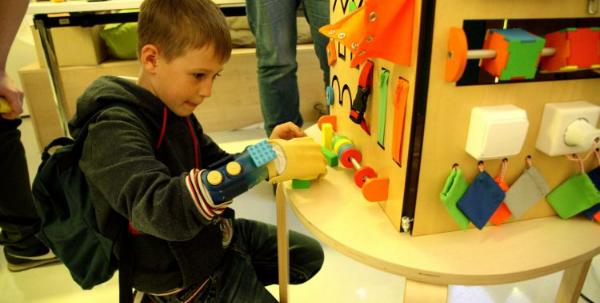 Установка завершилась, натяжение тросиков отрегулировали, и пришло время первых проб. Сначала Саша потренировался брать различные предметы: от деревянных объемных фигур разной формы до йогурта. Последний, кстати, заодно подкрепил силы юного испытателя.