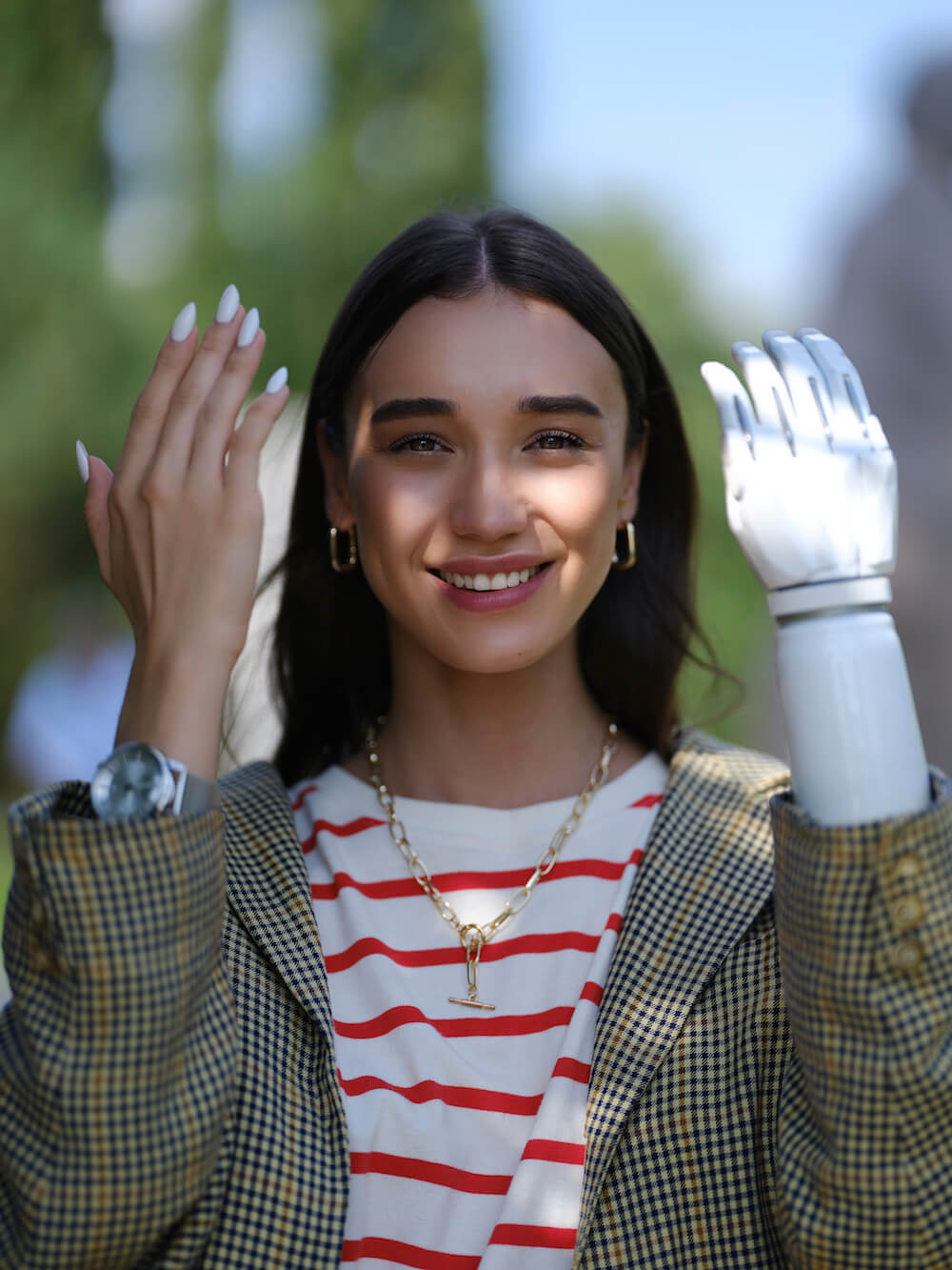 «Как девушка-киборг, наверное. Это благодаря тем технологиям, которые помогают нам эмоционально, помогают чувствовать себя увереннее и круче. Это то, что нас выделяет. И недавно я пришла к одной мысли, как раз с мамой обсуждала это, она мне сказала, что если бы могла, то отдала бы мне свою руку. В тот момент я поняла, что я не хотела бы быть обычной. Если бы у меня был выбор, я бы выбрала то, что у меня сейчас есть.»
