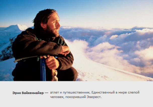 И знаете, чем сейчас больше всего гордится человек, покоривший Эверест? Тем самым своим самым первым восхождением. «Ты полагаешься на слух, на тактильные ощущения, на чувство равновесия, используешь все, что у тебя есть, чтобы компенсировать отсутствие зрения, я могу на слух определить, хорошо ли я зацепился топориком за лед. Я слышу пространство, я на слух отличаю открытое пространство от закрытого, это помогает мне ориентироваться. Я общаюсь с командой, она помогает мне понимать, какая впереди поверхность. Иногда мне помогает человек с колокольчиком, идущий впереди меня. Если звенит слева, значит он хочет, чтобы я двигался влево, если справа – вправо».